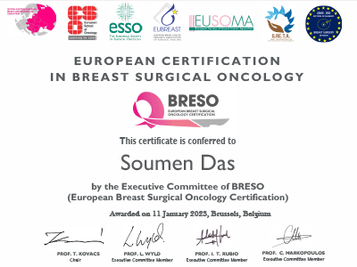 Dr. Soumen Das, a distinguished breast and cancer surgeon with over fifteen years of dedicated practice in eastern India, is renowned for his expertise and contributions to the field. A graduate of Medical College Kolkata, he earned his MBBS and MS in Surgery with multiple Gold Medals and Honours, including standing first in Surgery at the university level. Dr. Das further honed his skills through fellowships at prestigious institutions such as Tata Memorial Hospital in Mumbai and City of Hope Hospital in Los Angeles, USA, specializing in Surgical Oncology and robotic cancer surgery respectively. His professional achievements include European Breast Surgical Oncologist Certification, FRCS (Glasgow), and FACS (USA) conferred by The Royal College of Surgeons and Physicians of Glasgow and American College of Surgeons. Dr. Das's prolific career is marked by over fifty scientific publications, authorship of two books and numerous book chapters, and the invention of several innovative cancer surgical techniques. As the founder director of the Institute of Breast Disease, his visionary leadership has led to its rapid recognition by the European Breast Centres Network within a year of its establishment.